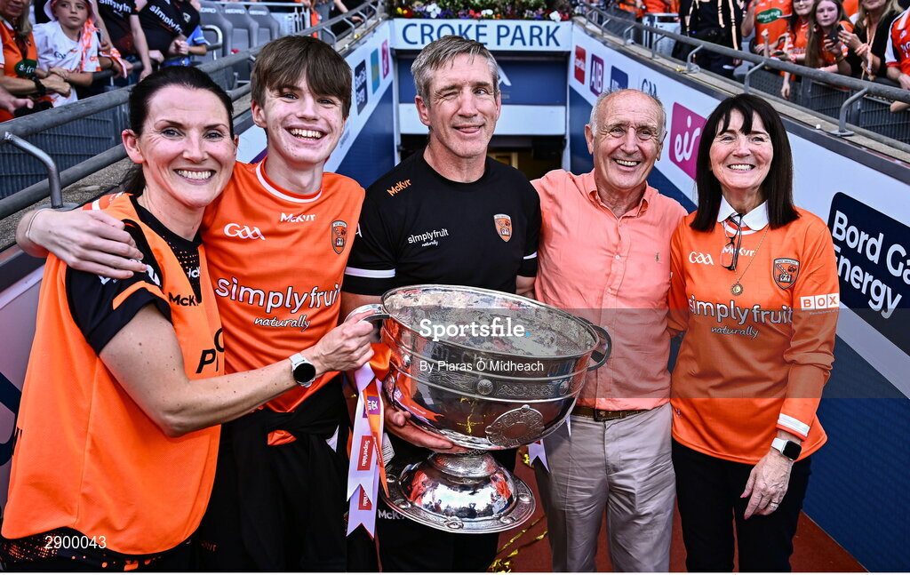 28 July 2024; Armagh manager Kieran McGeeney holds the Sam Maguire Cup as he celebrates with, from left, his wife Maura, his son Cian, and his parents Pat and Brigid after the GAA Football All-Ireland Senior Championship Final match between Armagh and Galway at Croke Park in Dublin. Photo by Piaras Ó Mídheach/Sportsfile