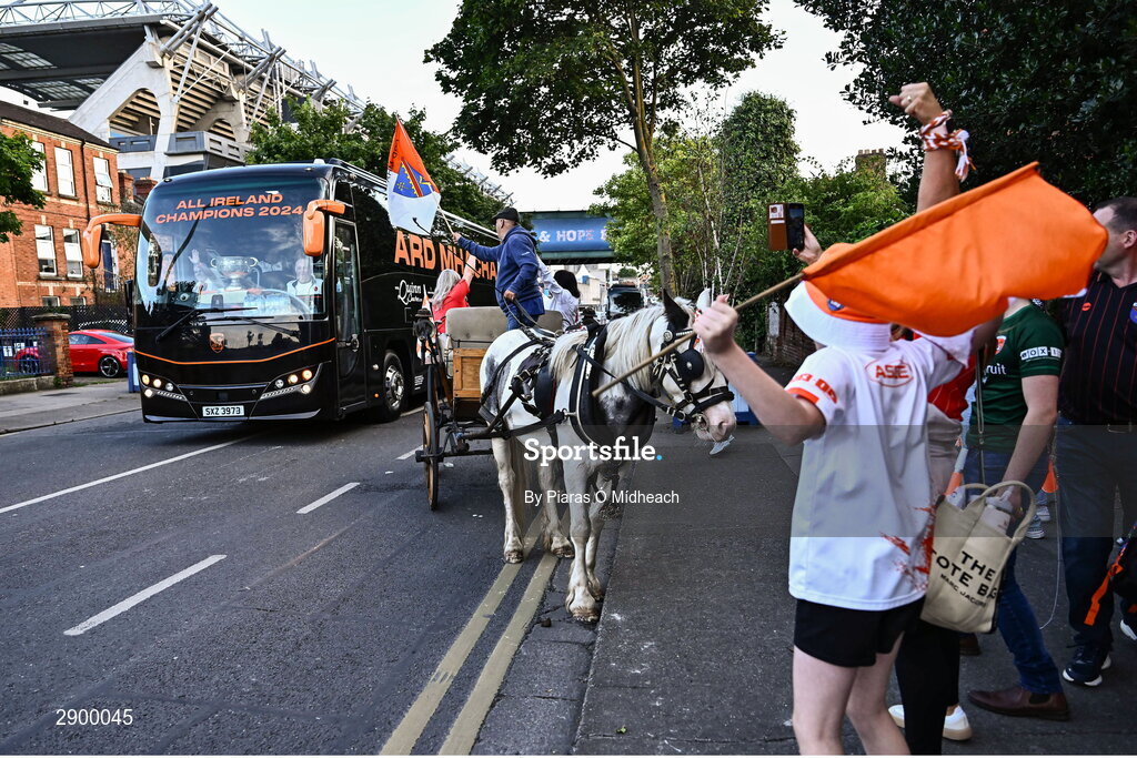 28 July 2024; The Armagh bus leaves Croke Park after the GAA Football All-Ireland Senior Championship Final match between Armagh and Galway at Croke Park in Dublin. Photo by Piaras Ó Mídheach/Sportsfile