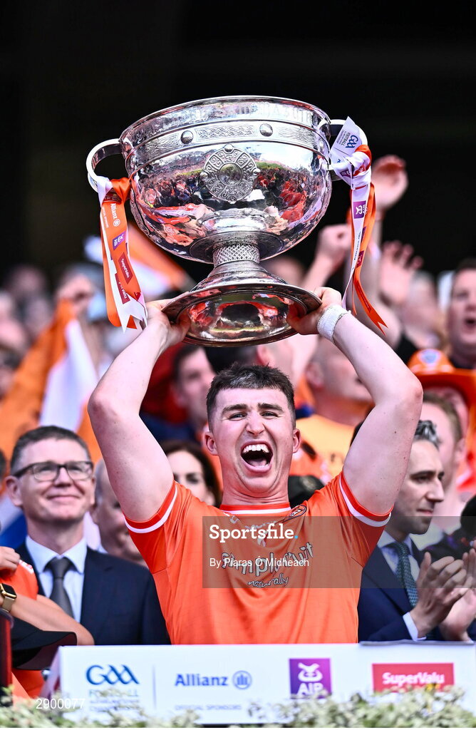 28 July 2024; Tiernan Kelly of Armagh lifts the Sam Maguire Cup after his side's victory in the GAA Football All-Ireland Senior Championship Final match between Armagh and Galway at Croke Park in Dublin. Photo by Piaras Ó Mídheach/Sportsfile