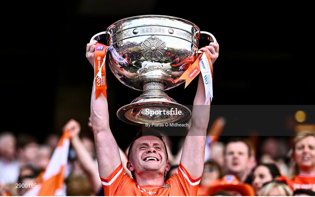 28 July 2024; Ross McQuillan of Armagh lifts the Sam Maguire Cup after his side's victory in the GAA Football All-Ireland Senior Championship Final match between Armagh and Galway at Croke Park in Dublin. Photo by Piaras Ó Mídheach/Sportsfile