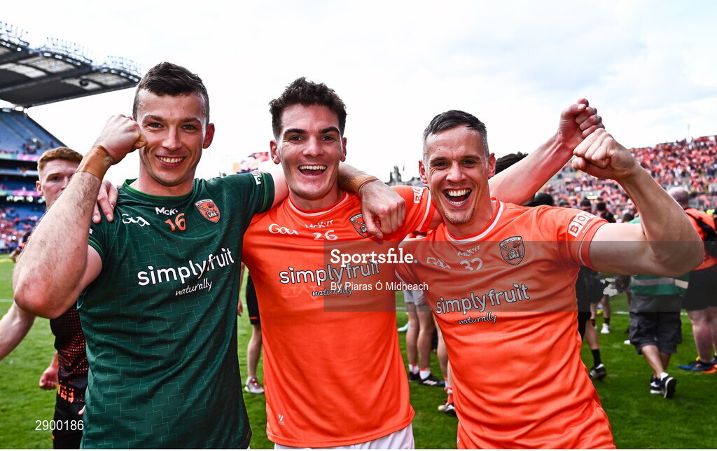 28 July 2024; Armagh players Ethan Rafferty, Jarly Óg Burns and Mark Shields celebrate after the GAA Football All-Ireland Senior Championship Final match between Armagh and Galway at Croke Park in Dublin. Photo by Piaras Ó Mídheach/Sportsfile