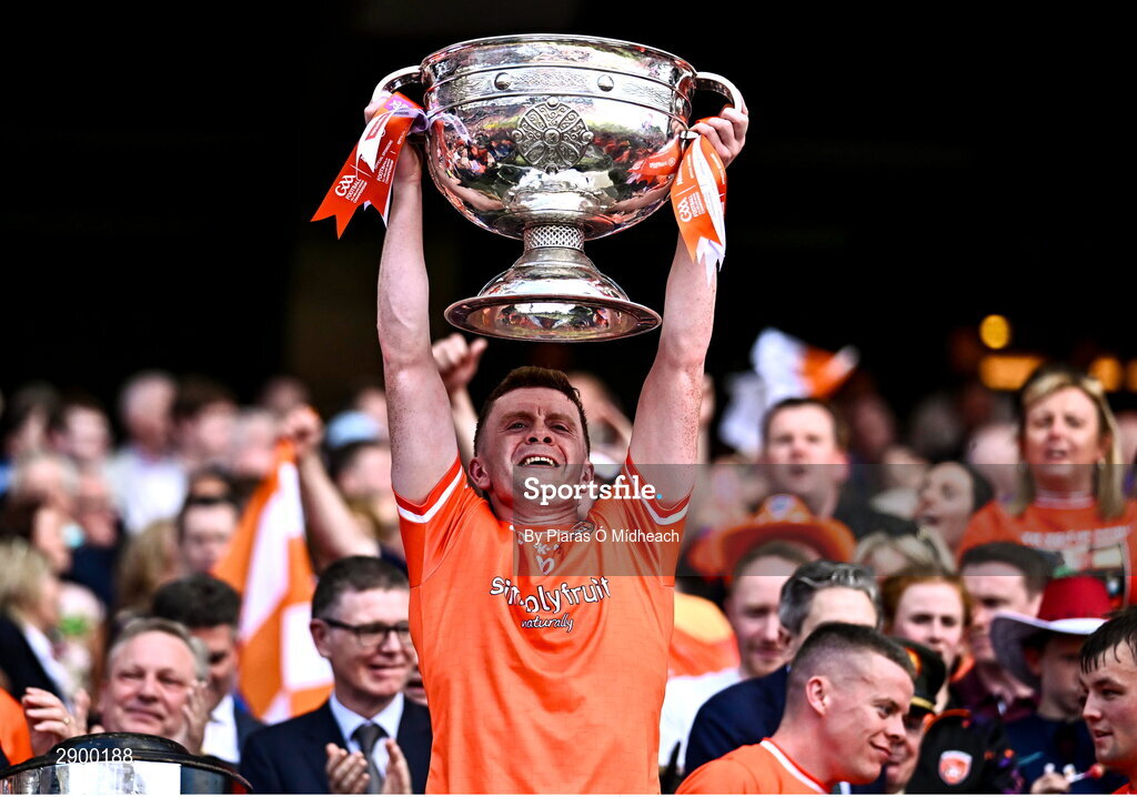 28 July 2024; Ross McQuillan of Armagh lifts the Sam Maguire Cup after his side's victory in the GAA Football All-Ireland Senior Championship Final match between Armagh and Galway at Croke Park in Dublin. Photo by Piaras Ó Mídheach/Sportsfile