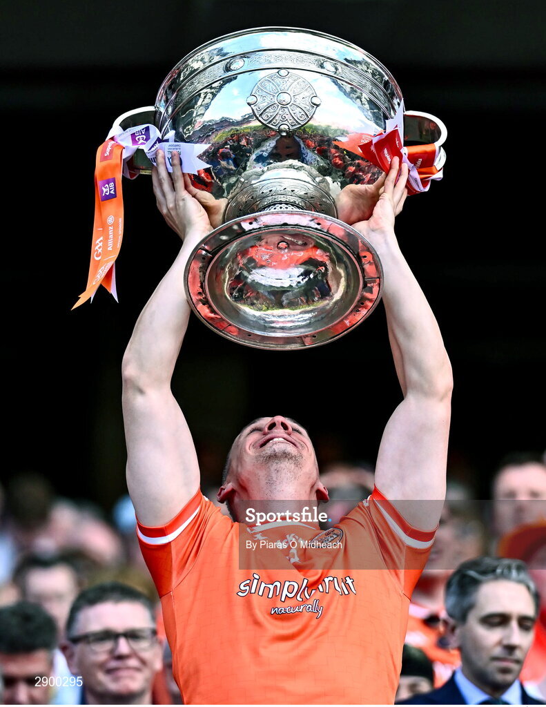 28 July 2024; Mark Shields of Armagh lifts the Sam Maguire Cup after his side's victory in the GAA Football All-Ireland Senior Championship Final match between Armagh and Galway at Croke Park in Dublin. Photo by Piaras Ó Mídheach/Sportsfile