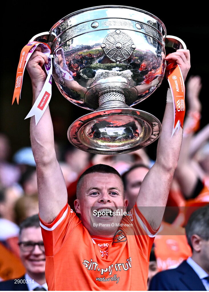 28 July 2024; Aidan Nugent of Armagh lifts the Sam Maguire Cup after his side's victory in the GAA Football All-Ireland Senior Championship Final match between Armagh and Galway at Croke Park in Dublin. Photo by Piaras Ó Mídheach/Sportsfile