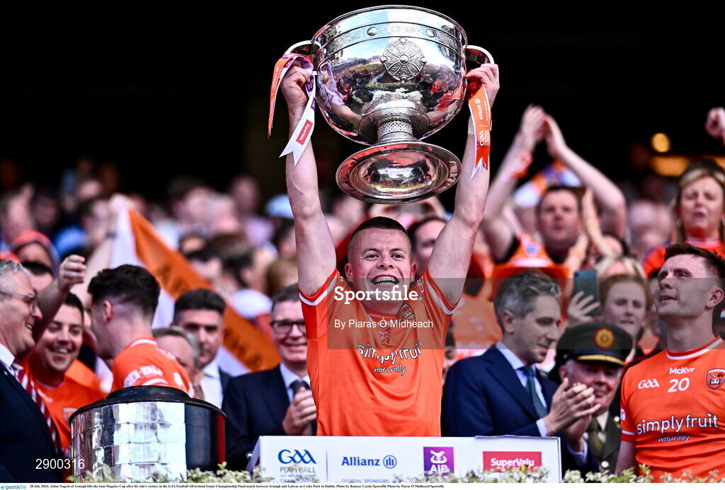 28 July 2024; Aidan Nugent of Armagh lifts the Sam Maguire Cup after his side's victory in the GAA Football All-Ireland Senior Championship Final match between Armagh and Galway at Croke Park in Dublin. Photo by Piaras Ó Mídheach/Sportsfile