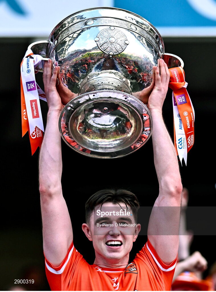 28 July 2024; Ben Crealey of Armagh lifts the Sam Maguire Cup after his side's victory in the GAA Football All-Ireland Senior Championship Final match between Armagh and Galway at Croke Park in Dublin. Photo by Piaras Ó Mídheach/Sportsfile