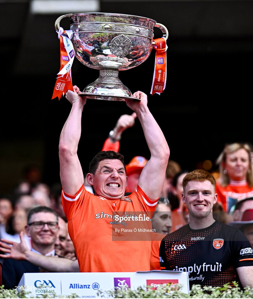 28 July 2024; Paddy Burns of Armagh lifts the Sam Maguire Cup after his side's victory in the GAA Football All-Ireland Senior Championship Final match between Armagh and Galway at Croke Park in Dublin. Photo by Piaras Ó Mídheach/Sportsfile