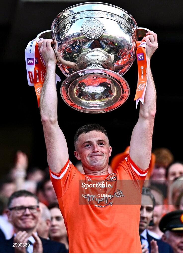 28 July 2024; Connaire Mackin of Armagh lifts the Sam Maguire Cup after his side's victory in the GAA Football All-Ireland Senior Championship Final match between Armagh and Galway at Croke Park in Dublin. Photo by Piaras Ó Mídheach/Sportsfile