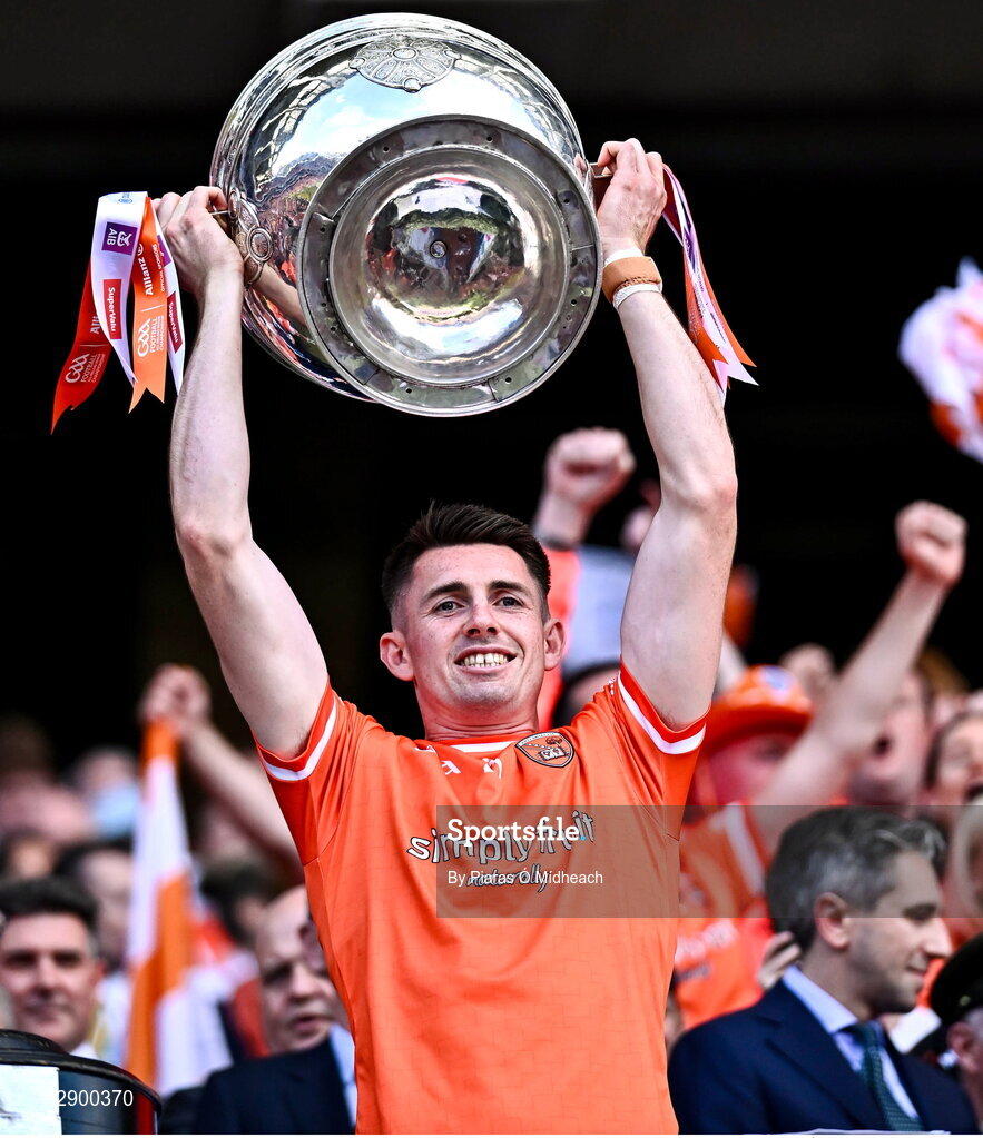 28 July 2024; Shane McPartlan of Armagh lifts the Sam Maguire Cup after his side's victory in the GAA Football All-Ireland Senior Championship Final match between Armagh and Galway at Croke Park in Dublin. Photo by Piaras Ó Mídheach/Sportsfile