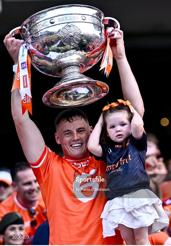 28 July 2024; Aaron McKay of Armagh lifts the Sam Maguire Cup after the GAA Football All-Ireland Senior Championship Final match between Armagh and Galway at Croke Park in Dublin. Photo by Piaras Ó Mídheach/Sportsfile