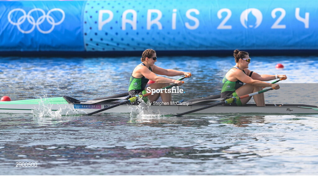 1 August 2024; Zoe Hyde, left, and Alison Bergin of Team Ireland in action during the women's double sculls B final at Vaires-sur-Marne Nautical Stadium during the 2024 Paris Summer Olympic Games in Paris, France. Photo by Stephen McCarthy/Sportsfile