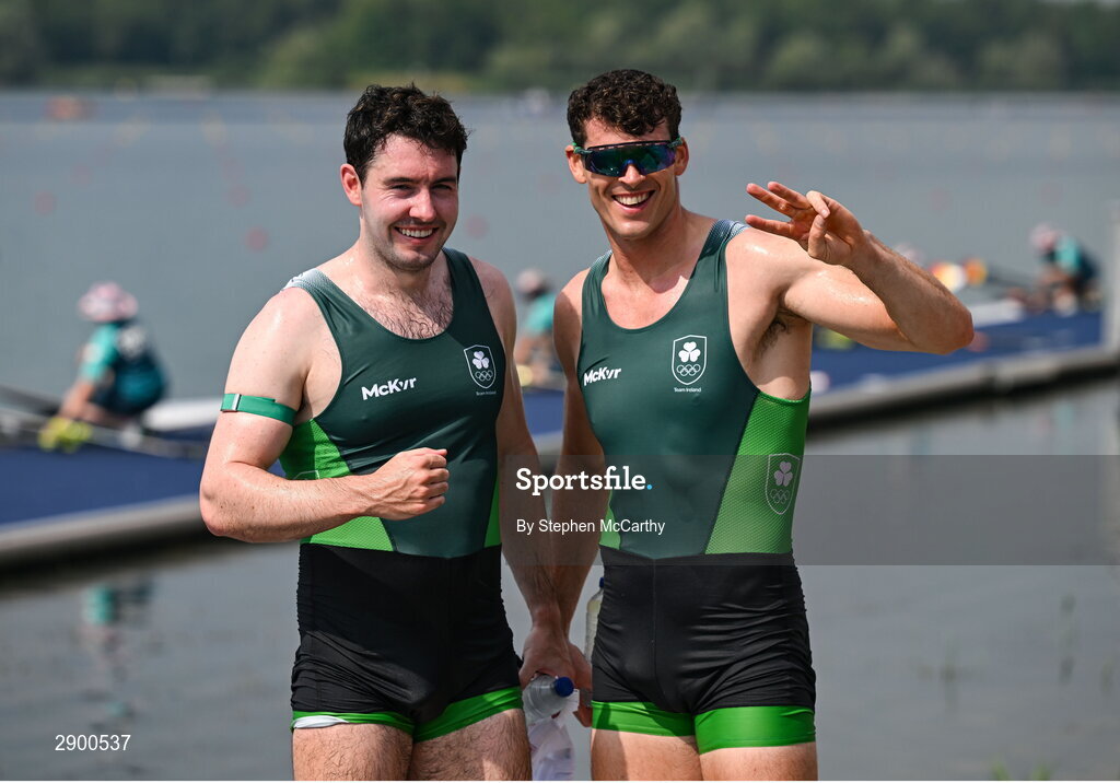 1 August 2024; Philip Doyle, left, and Daire Lynch of Team Ireland celebrate after winning bronze in the men's double sculls A final at Vaires-sur-Marne Nautical Stadium during the 2024 Paris Summer Olympic Games in Paris, France. Photo by Stephen McCarthy/Sportsfile