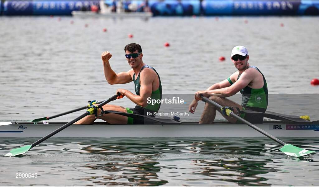 1 August 2024; Philip Doyle, right, and Daire Lynch of Team Ireland celebrate after winning bronze in the men's double sculls A final at Vaires-sur-Marne Nautical Stadium during the 2024 Paris Summer Olympic Games in Paris, France. Photo by Stephen McCarthy/Sportsfile