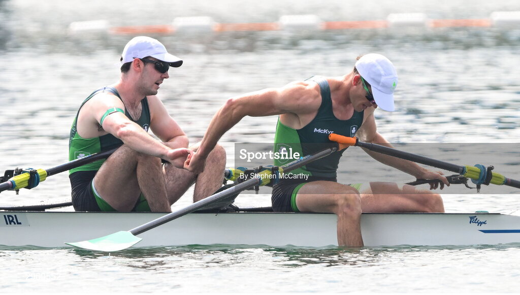 1 August 2024; Philip Doyle, left, and Daire Lynch of Team Ireland celebrate after winning bronze in the men's double sculls A final at Vaires-sur-Marne Nautical Stadium during the 2024 Paris Summer Olympic Games in Paris, France. Photo by Stephen McCarthy/Sportsfile