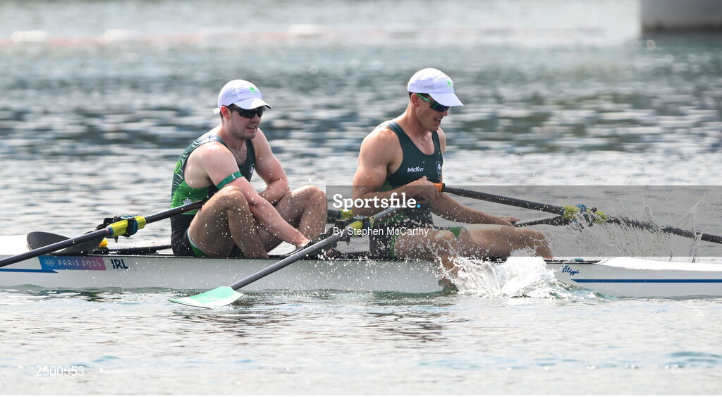 1 August 2024; Philip Doyle, left, and Daire Lynch of Team Ireland celebrate after winning bronze in the men's double sculls A final at Vaires-sur-Marne Nautical Stadium during the 2024 Paris Summer Olympic Games in Paris, France. Photo by Stephen McCarthy/Sportsfile