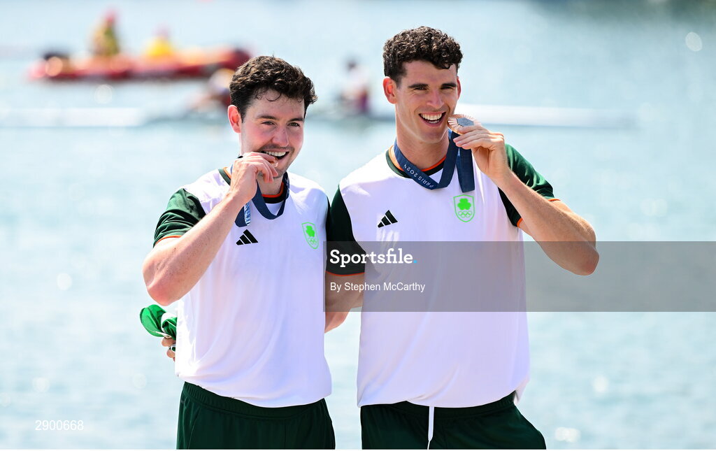 1 August 2024; Daire Lynch, left, and Philip Doyle of Team Ireland with their bronze medals after finishing third in the men's double sculls A final at Vaires-sur-Marne Nautical Stadium during the 2024 Paris Summer Olympic Games in Paris, France. Photo by Stephen McCarthy/Sportsfile