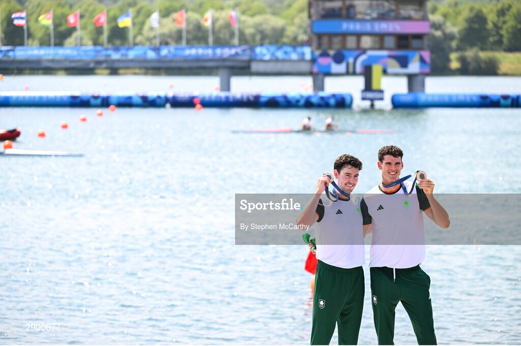 1 August 2024; Daire Lynch, left, and Philip Doyle of Team Ireland with their bronze medals after finishing third in the men's double sculls A final at Vaires-sur-Marne Nautical Stadium during the 2024 Paris Summer Olympic Games in Paris, France. Photo by Stephen McCarthy/Sportsfile