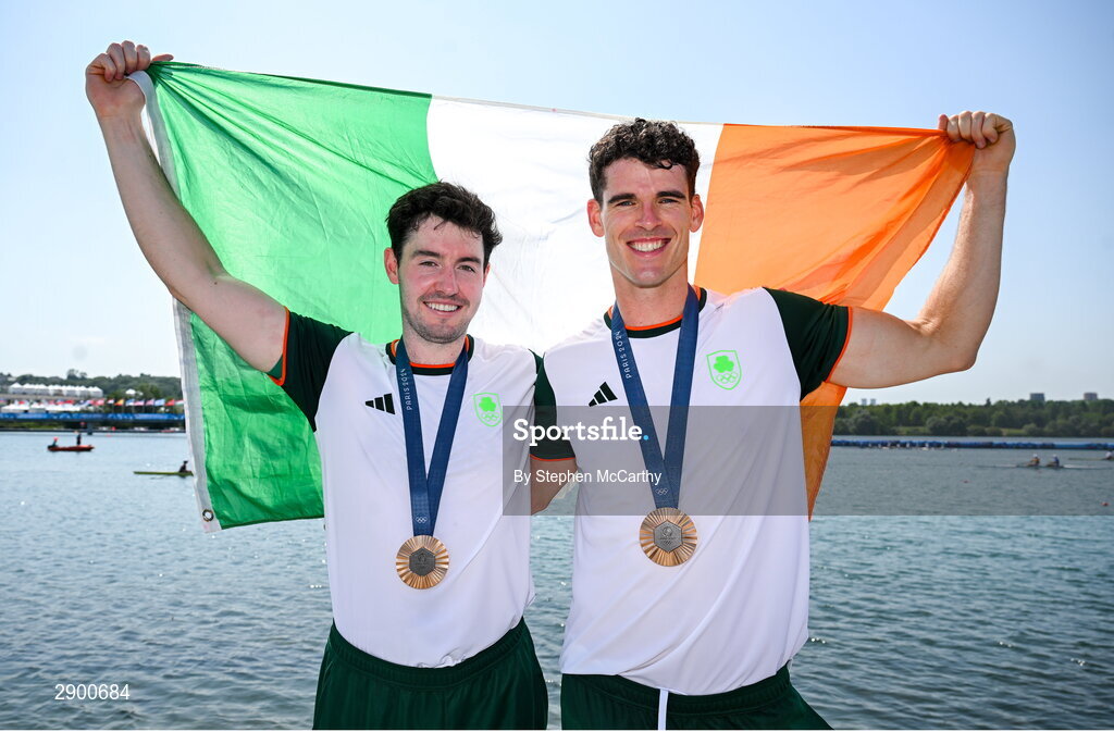 1 August 2024; Philip Doyle, right, and Daire Lynch of Team Ireland celebrate with their bronze medals after the men's double sculls A final at Vaires-sur-Marne Nautical Stadium during the 2024 Paris Summer Olympic Games in Paris, France. Photo by Stephen McCarthy/Sportsfile