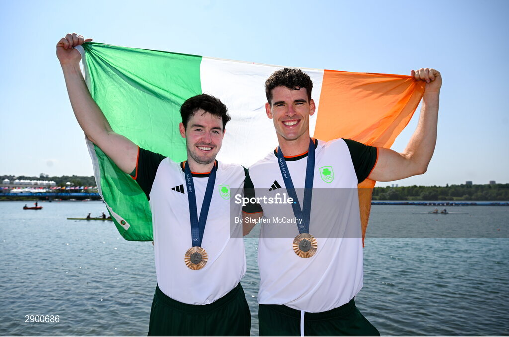 1 August 2024; Philip Doyle, right, and Daire Lynch of Team Ireland celebrate with their bronze medals after the men's double sculls A final at Vaires-sur-Marne Nautical Stadium during the 2024 Paris Summer Olympic Games in Paris, France. Photo by Stephen McCarthy/Sportsfile