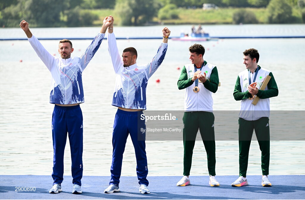 1 August 2024; From left, Men's double sculls A gold medallists Marian Florian Enache and Andrei Sabastian Cornea of Team Romania and bronze medallists Philip Doyle and Daire Lynch of Team Ireland during the awards ceremony at Vaires-sur-Marne Nautical Stadium during the 2024 Paris Summer Olympic Games in Paris, France. Photo by Stephen McCarthy/Sportsfile