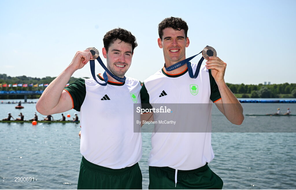 1 August 2024; Philip Doyle, right, and Daire Lynch of Team Ireland celebrate with their bronze medals after the men's double sculls A final at Vaires-sur-Marne Nautical Stadium during the 2024 Paris Summer Olympic Games in Paris, France. Photo by Stephen McCarthy/Sportsfile