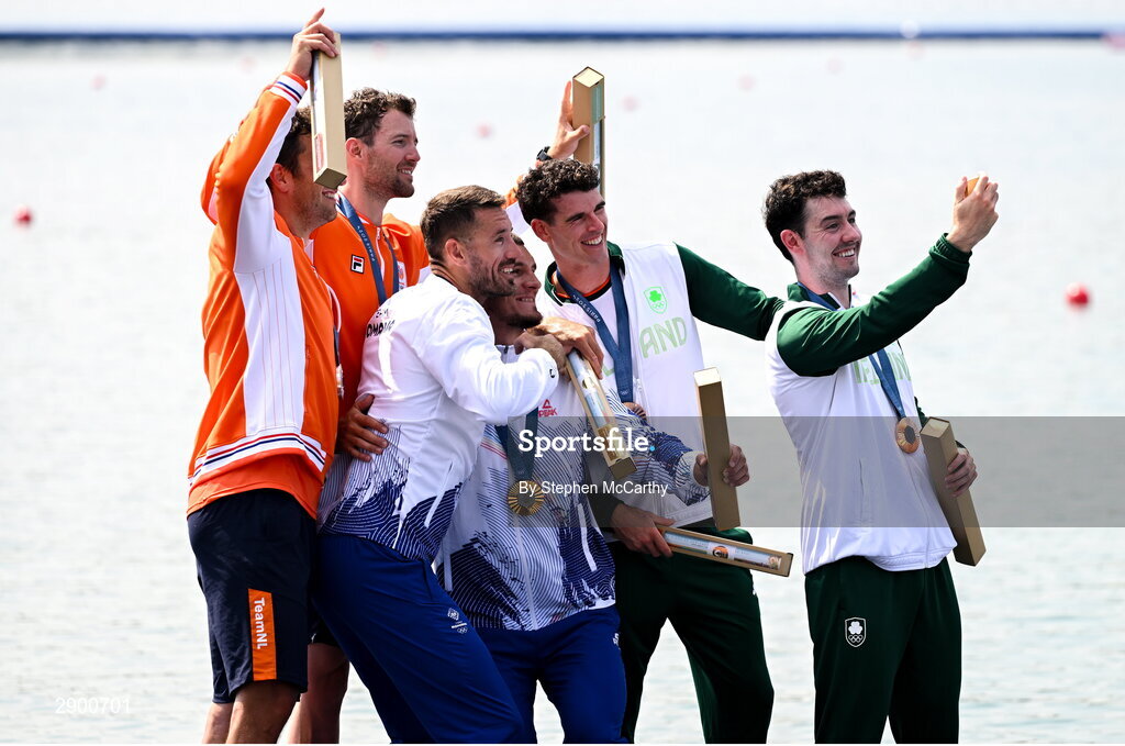 1 August 2024; Men's double sculls A bronze medallists Daire Lynch, right, and Philip Doyle of Team Ireland take a photo with gold medallists Andrei Sabastian Cornea and Marian Florian Enache of Team Romania and silver medallists Stef Broenink and Melvin Twellaar of Team Netherlands during the awards ceremony at Vaires-sur-Marne Nautical Stadium during the 2024 Paris Summer Olympic Games in Paris, France. Photo by Stephen McCarthy/Sportsfile