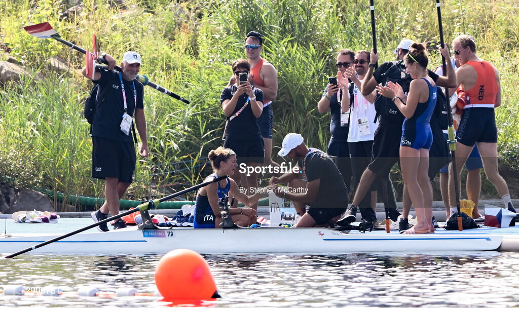 1 August 2024; Italian rower Catello Amarante proposes to Clara Guerra of Team Italy after her race with Stafania Gobbi in the women's double sculls B final at Vaires-sur-Marne Nautical Stadium during the 2024 Paris Summer Olympic Games in Paris, France. Photo by Stephen McCarthy/Sportsfile