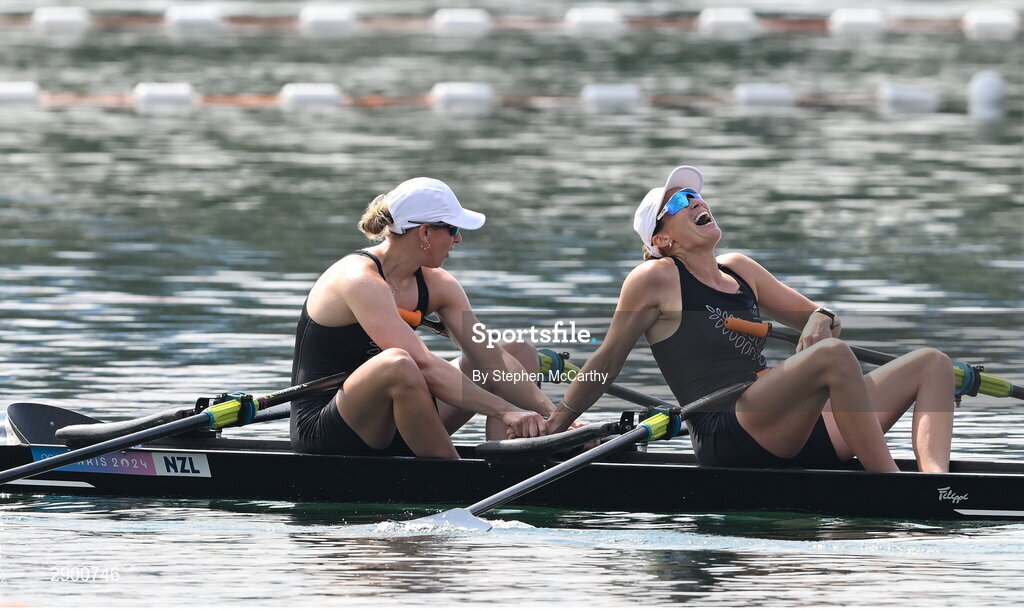 1 August 2024; Brooke Francis and Lucy Spoors of Team New Zealand celebrate after winning gold in the women's double sculls final at Vaires-sur-Marne Nautical Stadium during the 2024 Paris Summer Olympic Games in Paris, France. Photo by Stephen McCarthy/Sportsfile