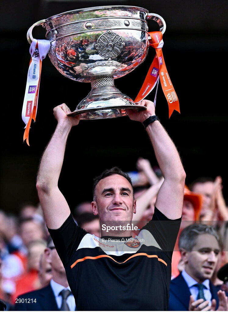 28 July 2024; Niall Rowland of Armagh lifts the Sam Maguire after the GAA Football All-Ireland Senior Championship Final match between Armagh and Galway at Croke Park in Dublin. Photo by Piaras Ó Mídheach/Sportsfile