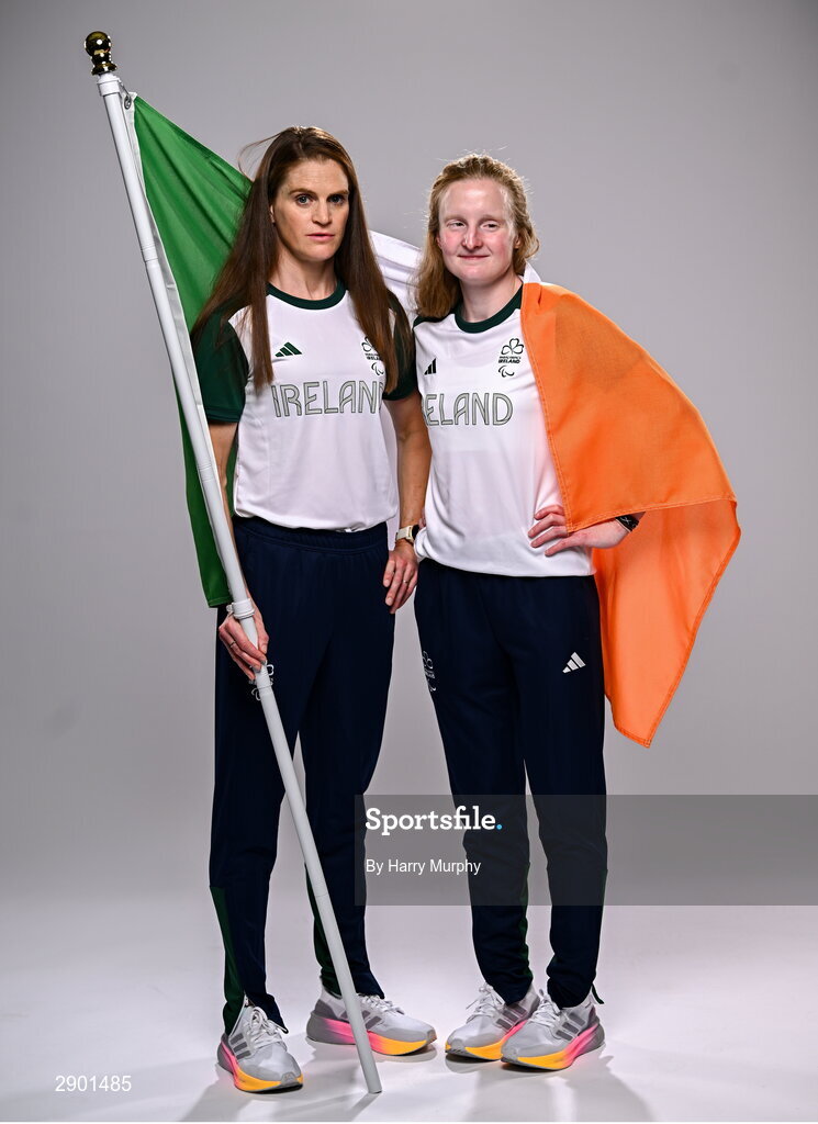 1 August 2024; Team Ireland complete as athletes for Para Equestrian, Para Triathlon and Para Rowing are unveiled at the RDS in Dublin. Paralympics Ireland athletes will compete at Paris 2024 this summer from August 28 - September 8 #TheNextLevel | #Paris2024 | #TeamIreland. Pictured is para-triathlete Judith MacCombe, right, and her guide Eimear Nicholls. Photo by Harry Murphy/Sportsfile