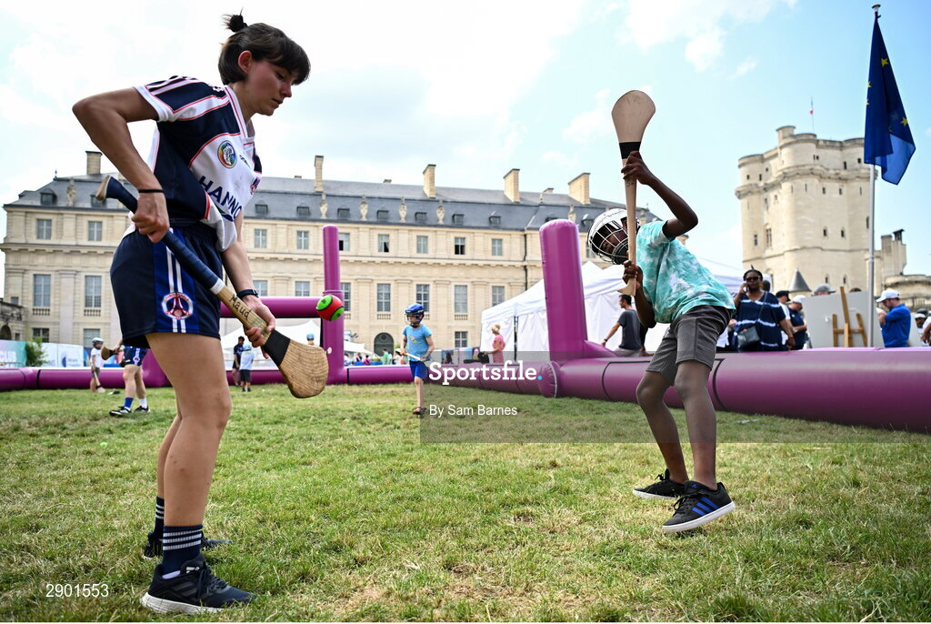 1 August 2024; Lewis Judith practices his hurling skills with Maud Pradella of Paris Gaels at Fesport Festival at the Cháteau de Vincennes during the 2024 Paris Summer Olympic Games in Paris, France. Photo by Sam Barnes/Sportsfile