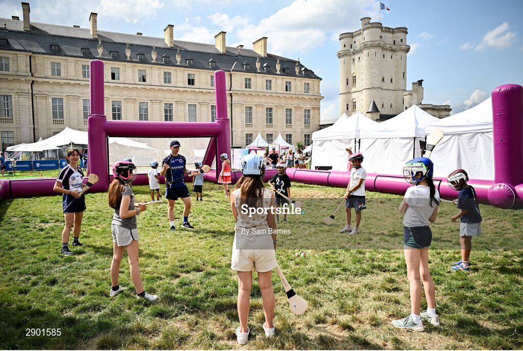 1 August 2024; Naoise Greene of Paris Gaels coaching attendees at Fesport Festival at the Cháteau de Vincennes during the 2024 Paris Summer Olympic Games in Paris, France. Photo by Sam Barnes/Sportsfile