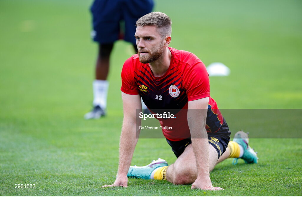 1 August 2024; Conor Keeley of St Patrick's Athletic warms up before the UEFA Conference League second qualifying round second leg match between FC Vaduz and St Patrick's Athletic at Rheinpark Stadion in Vaduz, Liechtenstein. Photo by Vedran Galijas/Sportsfile