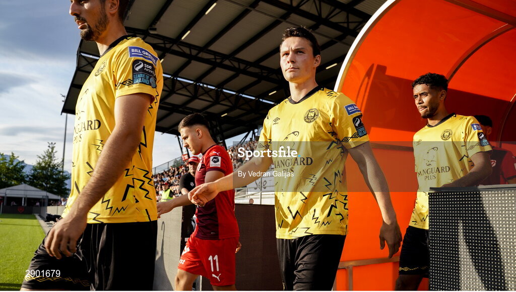 1 August 2024; Alex Sjoberg of St Patrick's Athletic, centre, makes his way onto the pitch before the UEFA Conference League second qualifying round second leg match between FC Vaduz and St Patrick's Athletic at Rheinpark Stadion in Vaduz, Liechtenstein. Photo by Vedran Galijas/Sportsfile