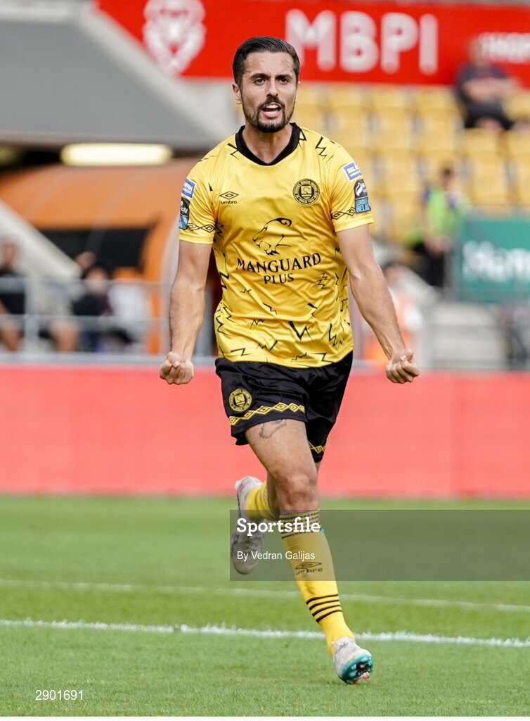 1 August 2024; Zachary Elbouzedi of St Patrick's Athletic celebrates after scoring his side's first goal during the UEFA Conference League second qualifying round second leg match between FC Vaduz and St Patrick's Athletic at Rheinpark Stadion in Vaduz, Liechtenstein. Photo by Vedran Galijas/Sportsfile