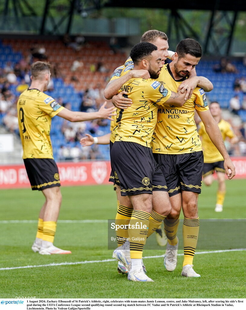 1 August 2024; Zachary Elbouzedi of St Patrick's Athletic, right, celebrates with team-mates Jamie Lennon, centre, and Jake Mulraney, left, after scoring his side's first goal during the UEFA Conference League second qualifying round second leg match between FC Vaduz and St Patrick's Athletic at Rheinpark Stadion in Vaduz, Liechtenstein. Photo by Vedran Galijas/Sportsfile