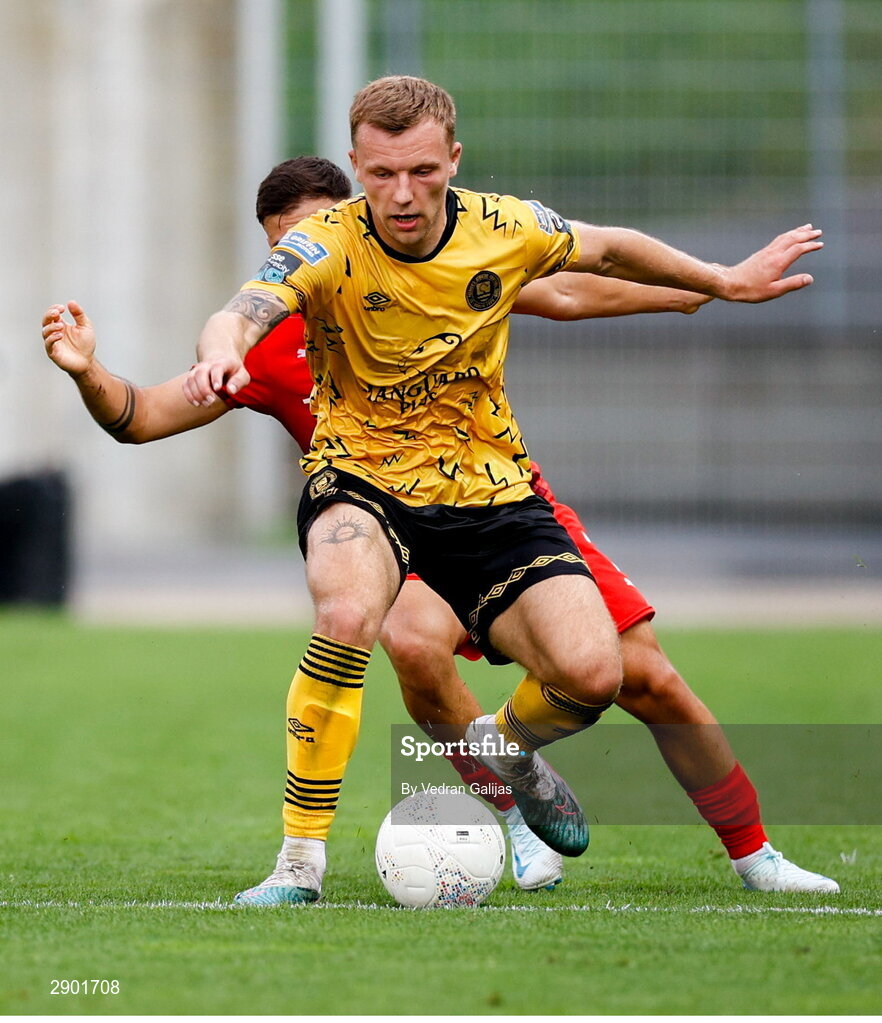 1 August 2024; Jamie Lennon of St Patrick's Athletic in action against Danilo Del Toro of FC Vaduz during the UEFA Conference League second qualifying round second leg match between FC Vaduz and St Patrick's Athletic at Rheinpark Stadion in Vaduz, Liechtenstein. Photo by Vedran Galijas/Sportsfile