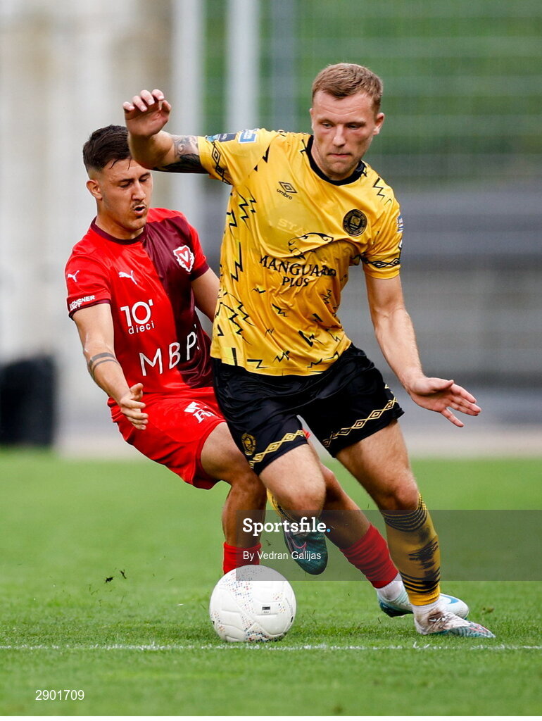 1 August 2024; Jamie Lennon of St Patrick's Athletic in action against Danilo Del Toro of FC Vaduz during the UEFA Conference League second qualifying round second leg match between FC Vaduz and St Patrick's Athletic at Rheinpark Stadion in Vaduz, Liechtenstein. Photo by Vedran Galijas/Sportsfile