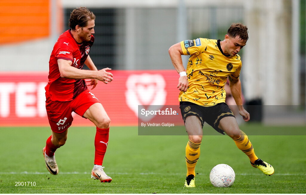 1 August 2024; Anto Breslin of St Patrick's Athletic in action against Liridon Berisha of FC Vaduz during the UEFA Conference League second qualifying round second leg match between FC Vaduz and St Patrick's Athletic at Rheinpark Stadion in Vaduz, Liechtenstein. Photo by Vedran Galijas/Sportsfile