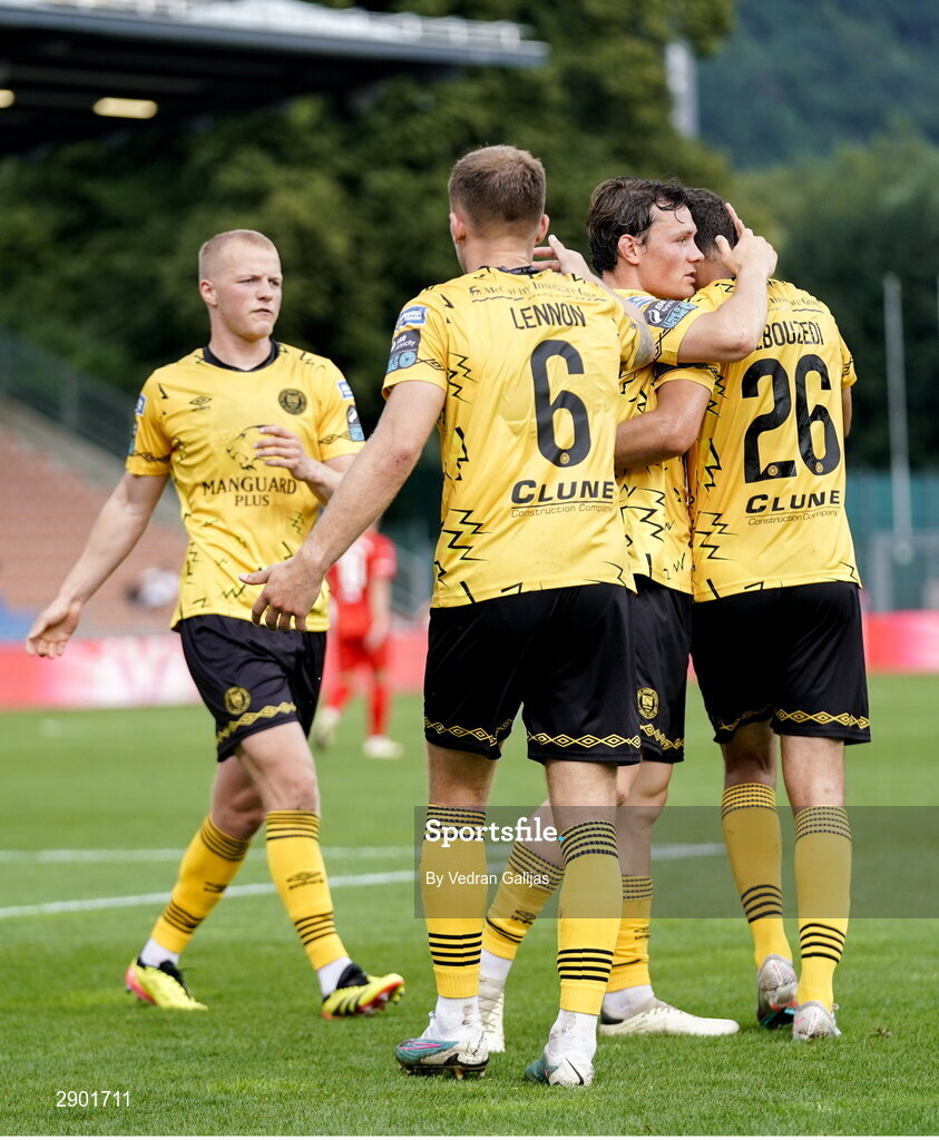 1 August 2024; Zachary Elbouzedi of St Patrick's Athletic, 26, is congratulated by team-mates, Tom Grivosti, left, Jamie Lennon, 6, and Carl Axel Sjoberg after scoring his side's first goal during the UEFA Conference League second qualifying round second leg match between FC Vaduz and St Patrick's Athletic at Rheinpark Stadion in Vaduz, Liechtenstein. Photo by Vedran Galijas/Sportsfile