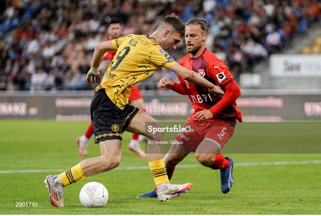 1 August 2024; Mason Melia of St Patrick's Athletic in action against Liridon Berisha of FC Vaduz during the UEFA Conference League second qualifying round second leg match between FC Vaduz and St Patrick's Athletic at Rheinpark Stadion in Vaduz, Liechtenstein. Photo by Vedran Galijas/Sportsfile