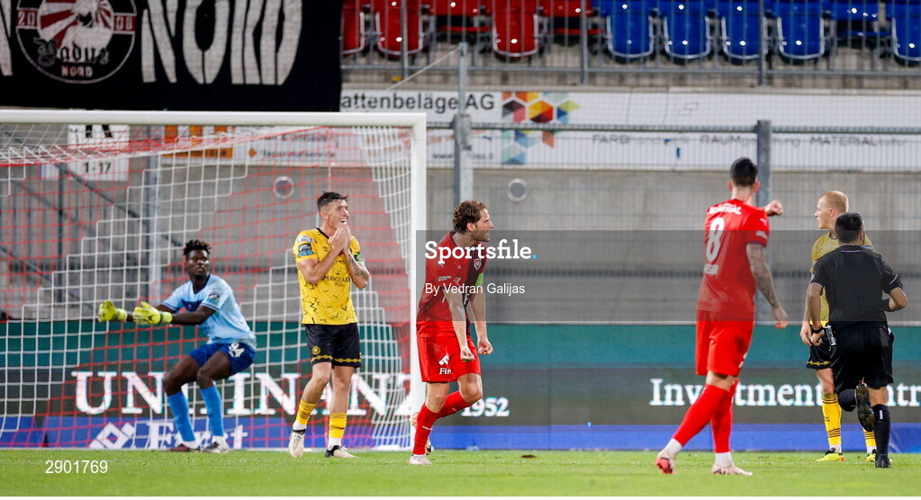 1 August 2024; Fabrizio Cavegn of FC Vaduz celebrates after scoring his side's second goal during the UEFA Conference League second qualifying round second leg match between FC Vaduz and St Patrick's Athletic at Rheinpark Stadion in Vaduz, Liechtenstein. Photo by Vedran Galijas/Sportsfile
