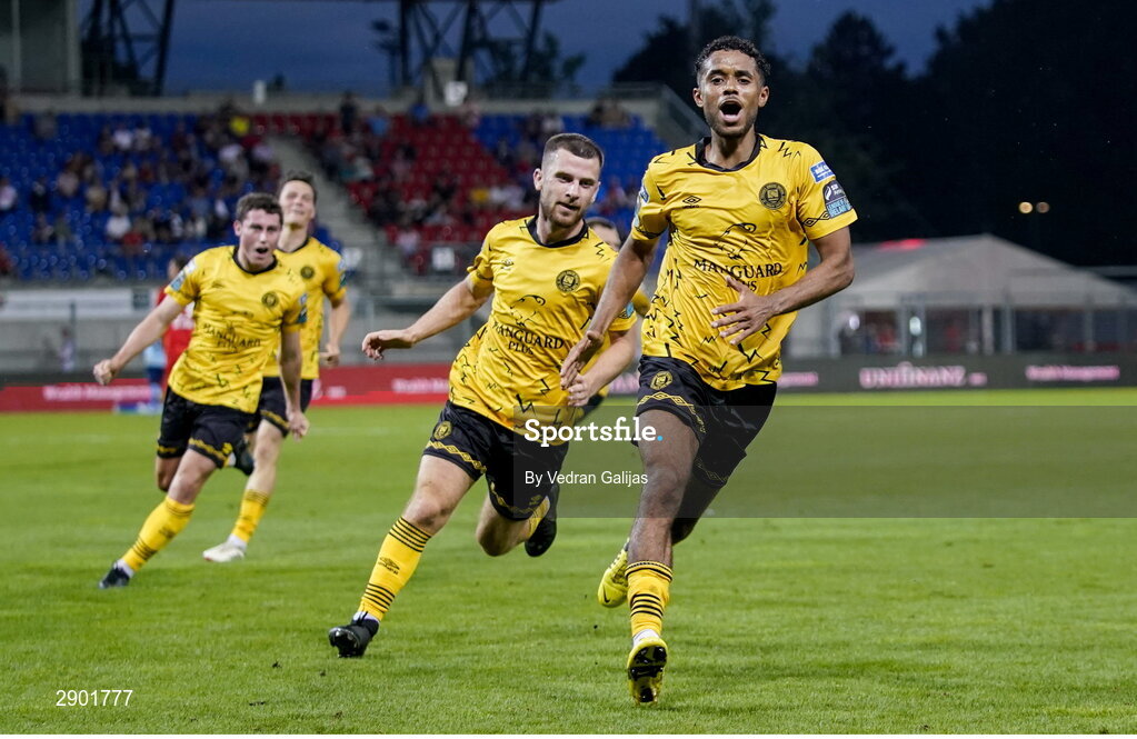 1 August 2024; Romal Palmer of St Patrick's Athletic celebrates after scoring his side's second goal during the UEFA Conference League second qualifying round second leg match between FC Vaduz and St Patrick's Athletic at Rheinpark Stadion in Vaduz, Liechtenstein. Photo by Vedran Galijas/Sportsfile