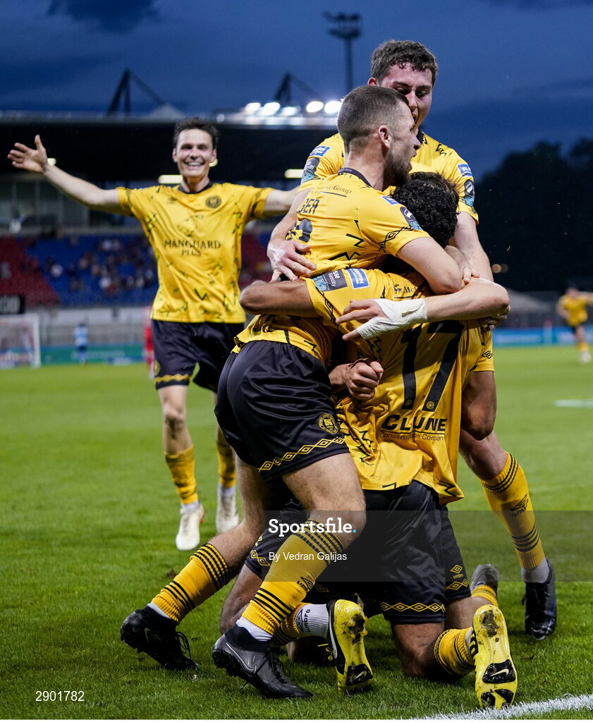 1 August 2024; Romal Palmer of St Patrick's Athletic, 17, celebrates with team-mates Aaron Bolger, left, and Mason Melia after scoring his side's second goal during the UEFA Conference League second qualifying round second leg match between FC Vaduz and St Patrick's Athletic at Rheinpark Stadion in Vaduz, Liechtenstein. Photo by Vedran Galijas/Sportsfile