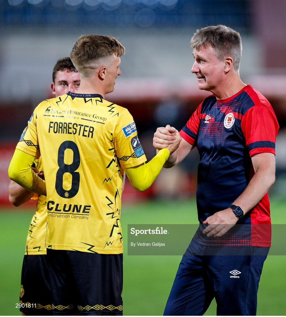 1 August 2024; St Patrick's Athletic manager Stephen Kenny and Chris Forrester after their side's draw in the UEFA Conference League second qualifying round second leg match between FC Vaduz and St Patrick's Athletic at Rheinpark Stadion in Vaduz, Liechtenstein. Photo by Vedran Galijas/Sportsfile