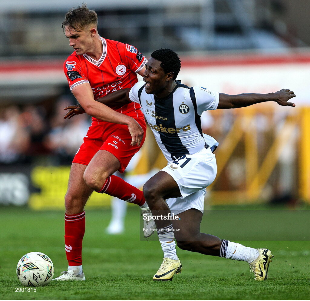 1 August 2024; Emmanuel Umeh of FC Zurich is tackled by Evan Caffrey of Shelbourne during the UEFA Conference League second qualifying round second leg match between Shelbourne and FC Zurich at Tolka Park in Dublin. Photo by Thomas Flinkow/Sportsfile
