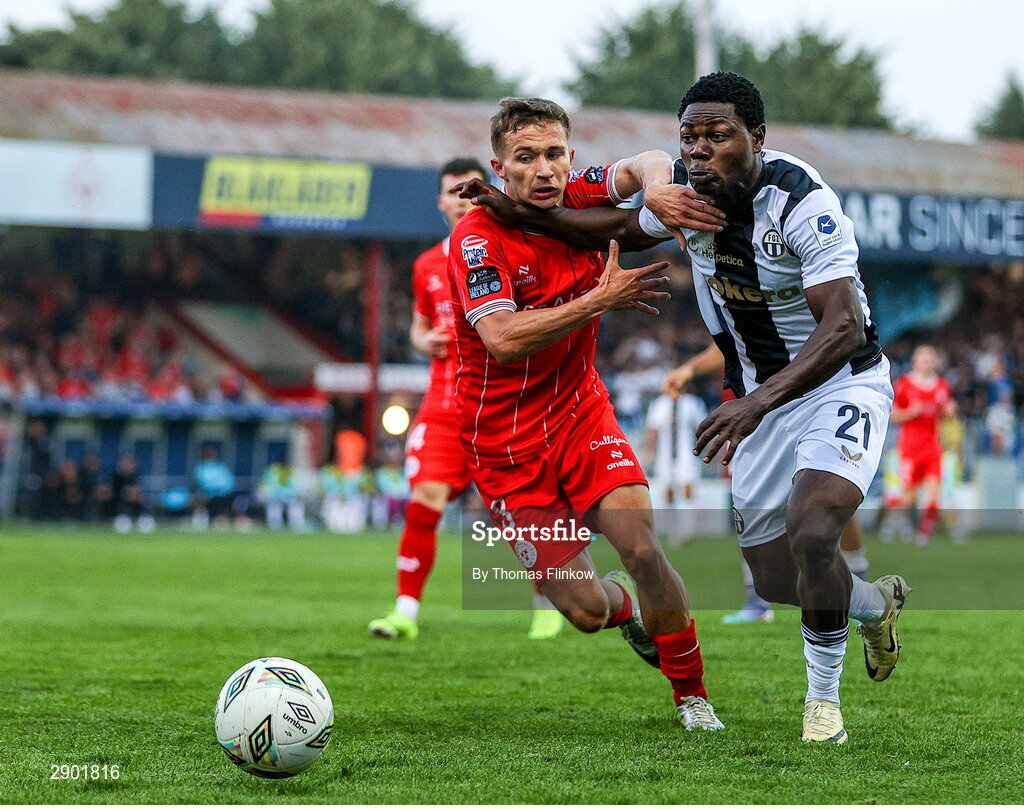 1 August 2024; Emmanuel Umeh of FC Zurich in action against Tyreke Wilson of Shelbourne during the UEFA Conference League second qualifying round second leg match between Shelbourne and FC Zurich at Tolka Park in Dublin. Photo by Thomas Flinkow/Sportsfile