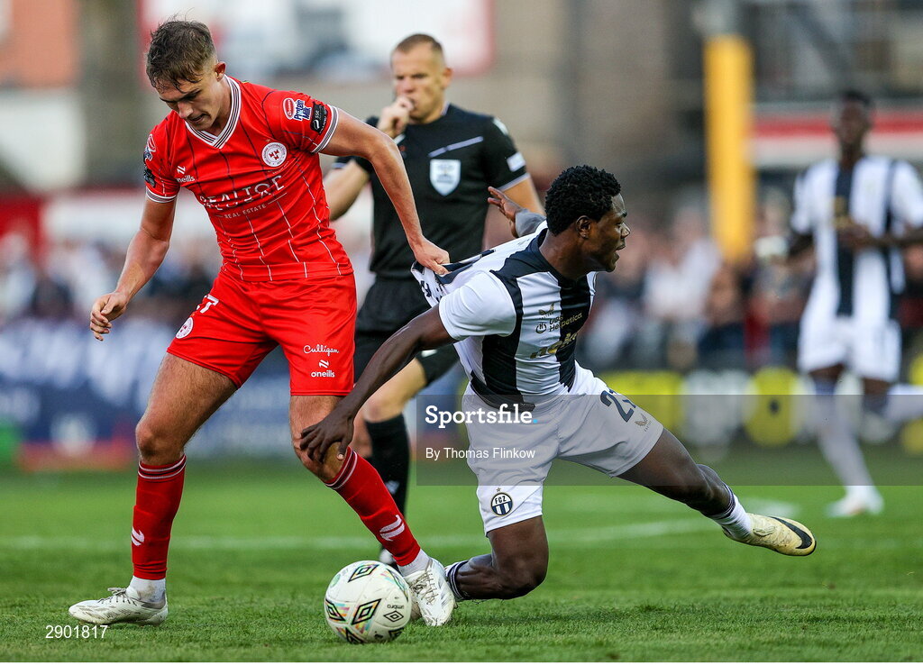 1 August 2024; Emmanuel Umeh of FC Zurich is fouled by Evan Caffrey of Shelbourne during the UEFA Conference League second qualifying round second leg match between Shelbourne and FC Zurich at Tolka Park in Dublin. Photo by Thomas Flinkow/Sportsfile