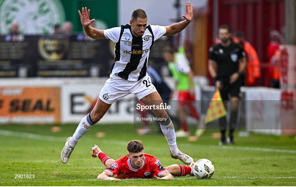 1 August 2024; Will Jarvis of Shelbourne in action against Nikola Katic of Zurich during the UEFA Conference League second qualifying round second leg match between Shelbourne and FC Zurich at Tolka Park in Dublin. Photo by Harry Murphy/Sportsfile