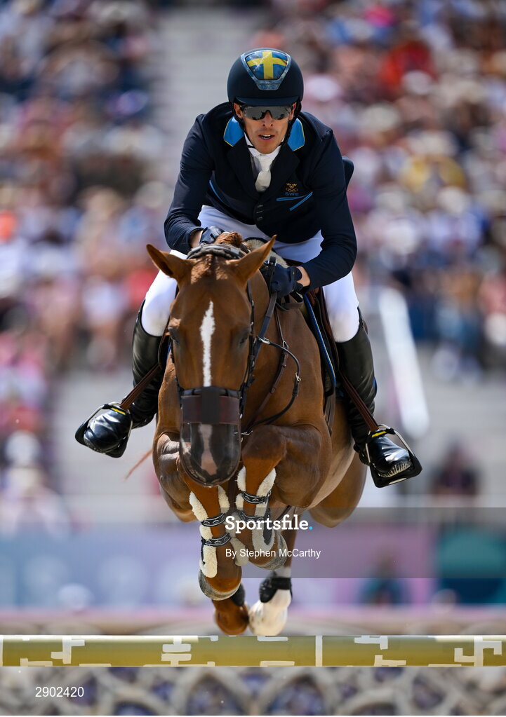 2 August 2024; Henrik von Eckermann of Team Sweden riding King Edward during the jumping team final at the Château de Versailles during the 2024 Paris Summer Olympic Games in Paris, France. Photo by Stephen McCarthy/Sportsfile